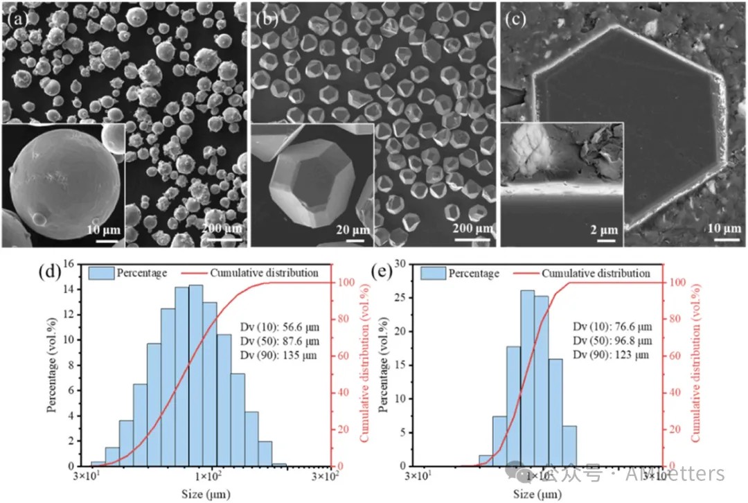 图1. 原料的形态和尺寸分布。(a, b) NiCu合金粉末和钨涂层金刚石颗粒的形态,(c) (b) 的截面图(插图为放大视图),(d, e) NiCu合金粉末和钨涂层金刚石颗粒的尺寸分布。