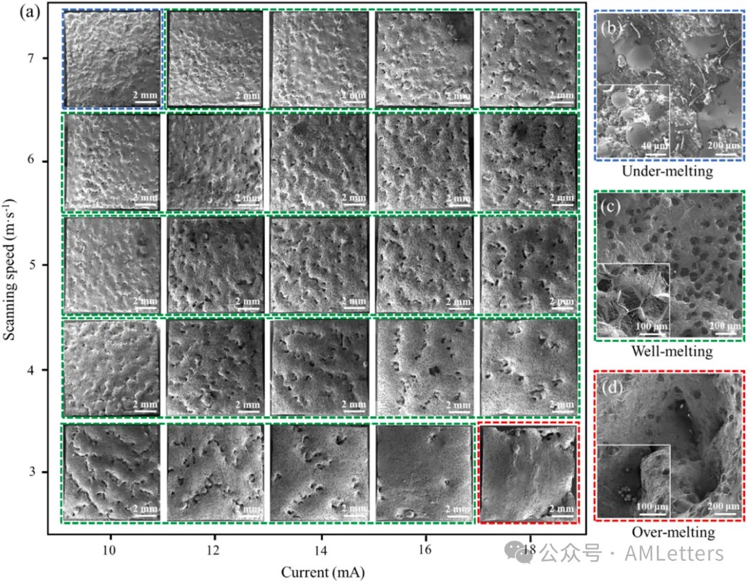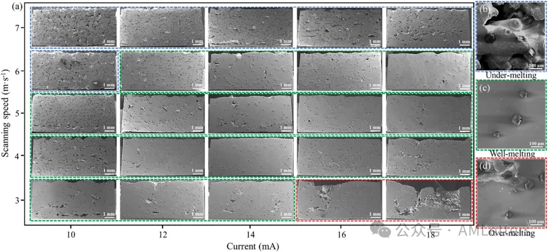 图3. (a) 不同扫描速度和束流下制备的PBF-EB NiCu/金刚石复合材料的表面形态。(b) 欠熔(蓝色虚线框圈出),(c) 良好熔化(绿色虚线框圈出),(d) 过熔(红色虚线框圈出)的代表性表面形态。