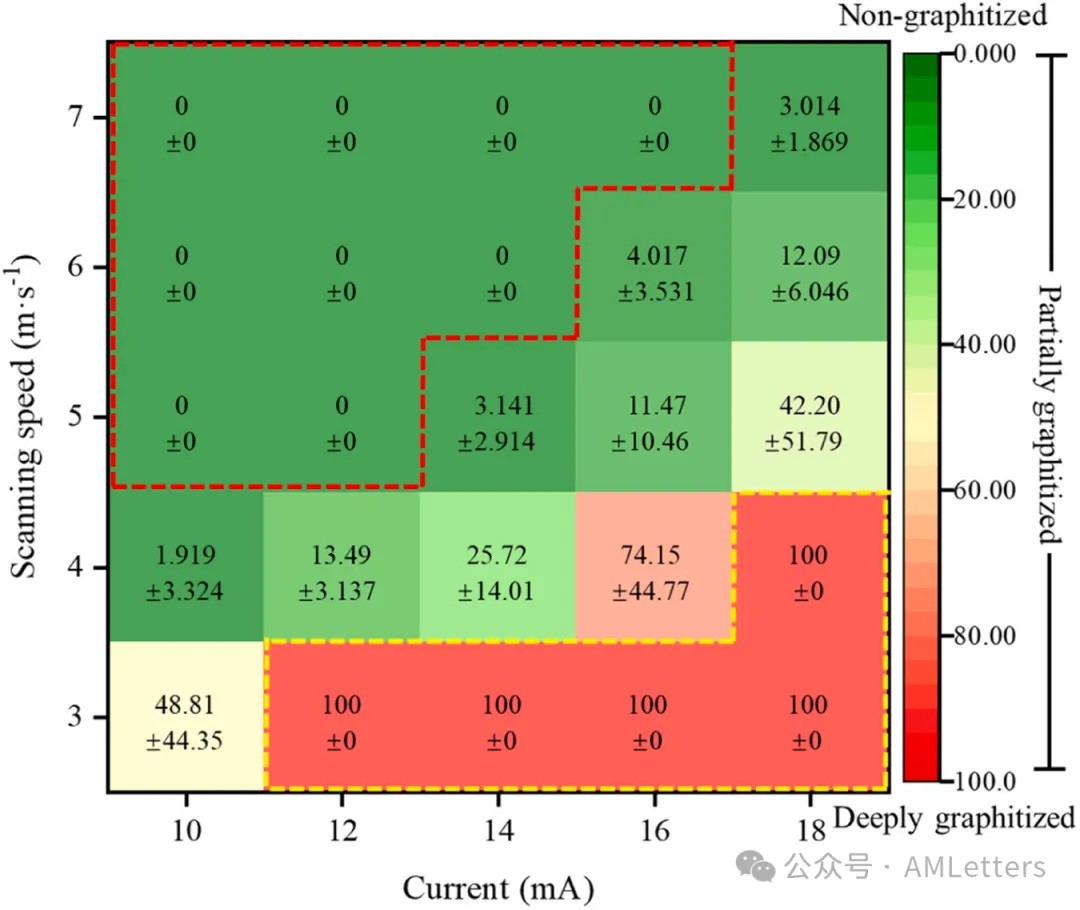 (4)此外,PBF-LB中的高能量密度会引发金刚石石墨化。当激光辐照温度超过700°C时,碳碳键从sp3杂化态转变为sp2杂化态,开始石墨化。石墨由于具有更高的激光吸收率,进一步加速了石墨化。