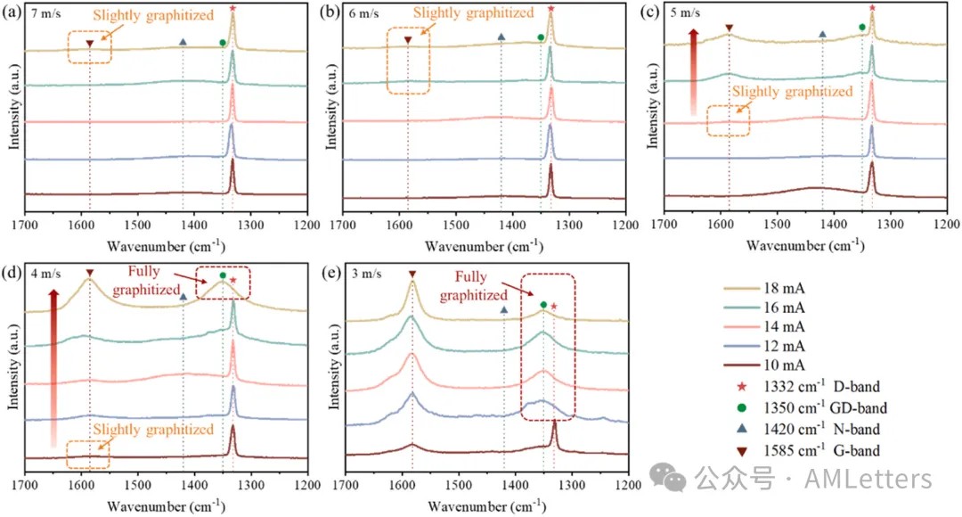 图8. PBF-EB NiCu/金刚石复合材料的拉曼光谱。束扫描速度分别为(a) 7 m/s,(b) 6 m/s,(c) 5 m/s,(d) 4 m/s,(e) 3 m/s。