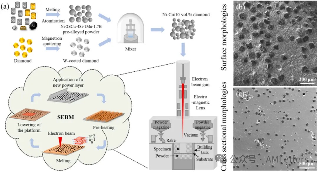 图2. (a) PBF-EB制备NiCu/金刚石复合材料的制备过程示意图,(b) 复合材料的表面形态和 (c) 横截面形态,展示均匀的金刚石分布。