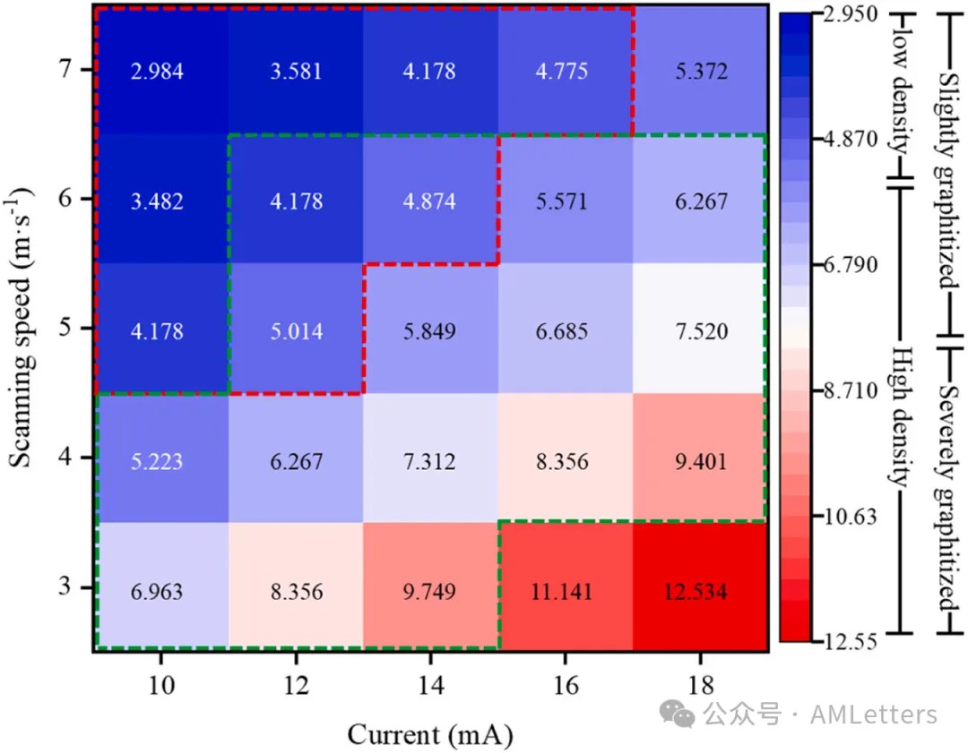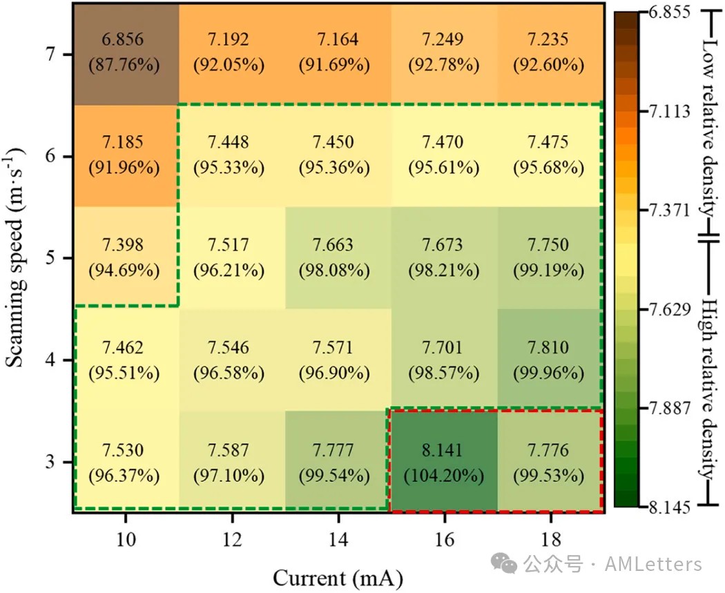 图5. 测量的密度和不同扫描速度及束流下制备的PBF-EB NiCu/金刚石复合材料的相对密度分布图。颜色从棕色到绿色的变化表示密度的增加。