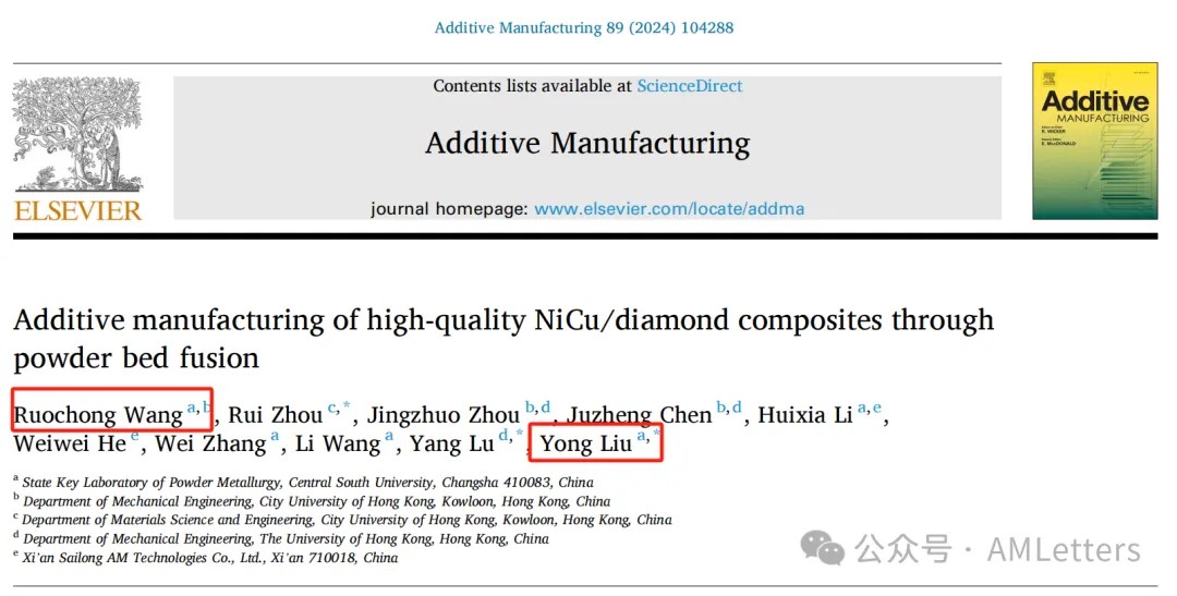 近日,中南大学粉末冶金研究院 刘咏教授 团队的 王若冲博士 等学者,在增材制造顶刊《Additive Manufacturing》上发表题为:粉末床增材制造NiCu/金刚石复合材料(Additive manufacturing of high-quality NiCu/diamond composites through powder bed fusion)的学术文章。他们首次应用电子束粉末床熔融(PBF-EB)技术制备了兼具高密度和优异的综合性能的NiCu/金刚石复合材料,并采用半定量模型计算出无量纲体积能量密度(DVED)值。优化的DVED值提供了普遍适用的范围,为其他金属/金刚石复合材料的PBF-EB过程提供了有价值的指导。