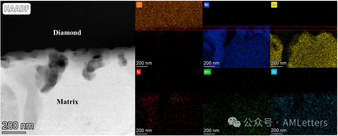 图15. NiCu合金基体与金刚石界面处的HAADF-STEM图像及相应的元素分布图。