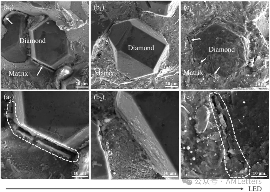 图6. 在不同激光能量密度(LED)下制备的PBF-EB NiCu/金刚石复合材料表面界面结合形态。(a) 低LED,(b) 中等LED,(c) 高LED。