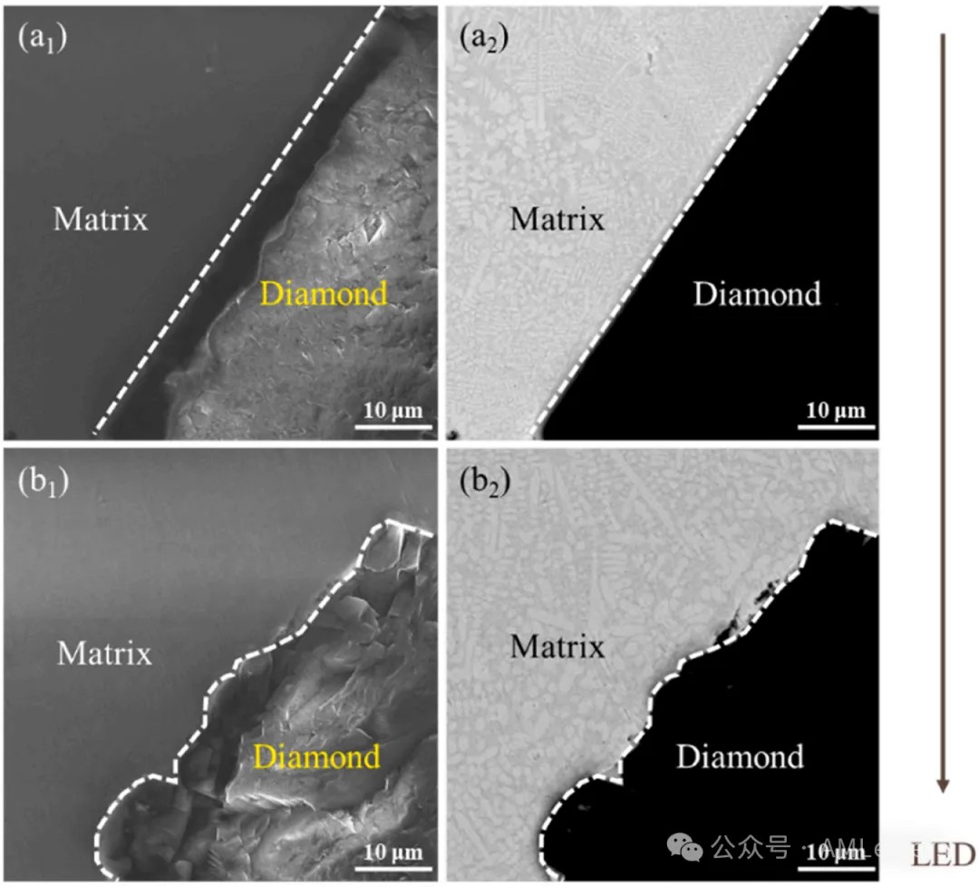 图7. PBF-EB NiCu/金刚石复合材料横截面界面结合形态。(a1, a2) 中等线性能量密度样品的SEI和BSEI图像,(b1, b2) 高线性能量密度样品的SEI和BSEI图像。