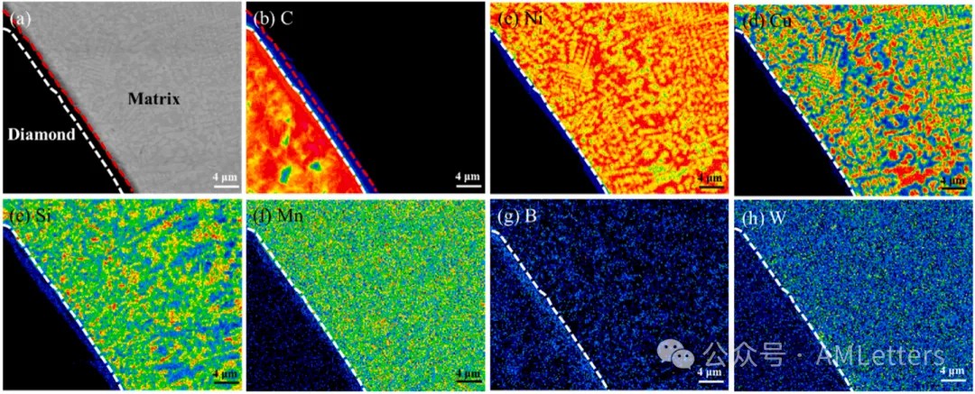 图14. 束流为12 mA、扫描速度为5 m/s的PBF-EB NiCu/金刚石复合材料的EPMA结果。(a) 金刚石与基体界面的微观结构BSEI图像。(b-h) 分别为C、Ni、Cu、Si、Mn、B和W的成分分布图。