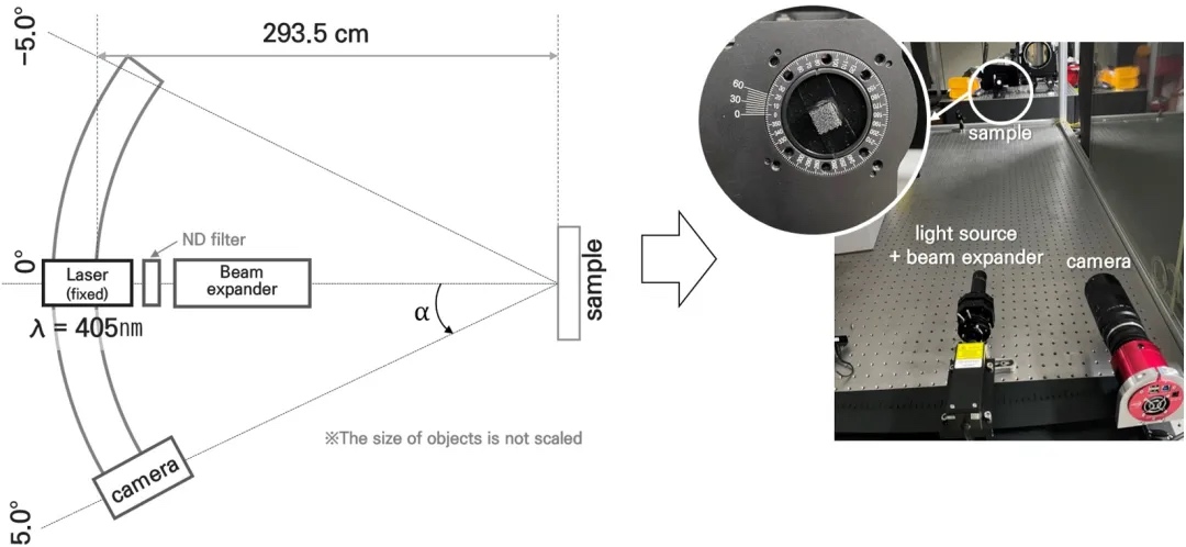 △图2. 实验装置示意图(左)及其实际外观(右)。激光和相机位于弧形配置的轨道上,允许相角范围从0°到10°,样品位于轨道293.5厘米处;为了控制激光的功率并增加光束尺寸,在激光和样品之间放置了两个中性密度滤光片和一个光束扩展器。