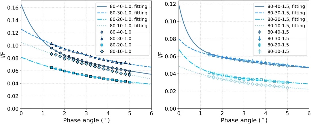 △图4. 在小相位角下,从相对密集(n=80)的样本中获得的反射相位曲线。