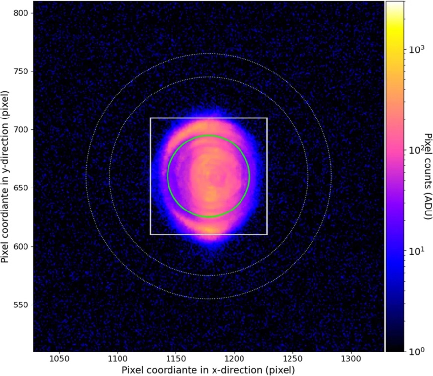 △图3. 一个组合样本图像的示例。该图像的目标是一个在1.4°相位角下拍摄的“70‐20‐1.0”样本。这个图像通过结合150帧生成,对应于一个完整的旋转;图像的x轴和y轴代表一个2500 × 1150px图像的像素坐标;图右侧的颜色条显示了ADU中的像素计数;绿色圆圈、白色正方形和带有虚线的环形分别代表光度孔径(半径为35像素)、样本的实际大小以及内、外天空环形。