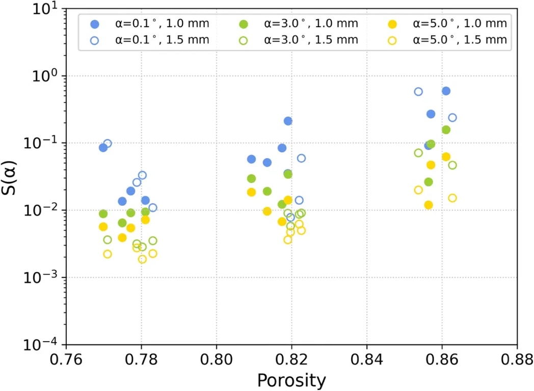 △图7. 样品孔隙度的相位曲线(S(α))的斜率,以对数刻度表示。蓝色、绿色和黄色符号分别对应于相位角为0.1、3.0和5.0°时的切线斜率。