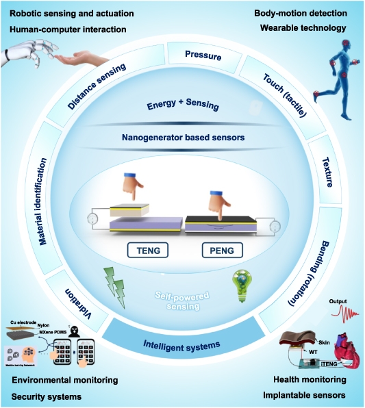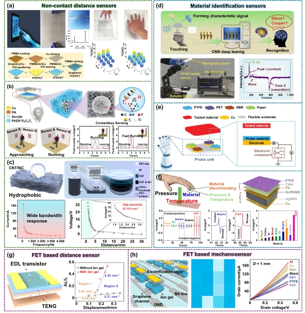 对于摩擦电传感器,表面改性技术如等离子处理、微结构化和介电常数优化,已被用来增强性能。这些策略提升了电荷转移效率,促进了耐用、高输出传感器的开发。研究人员还展示了混合材料和纳米结构在保持灵活性和环境适应性的同时,提高摩擦电性能的有效性。