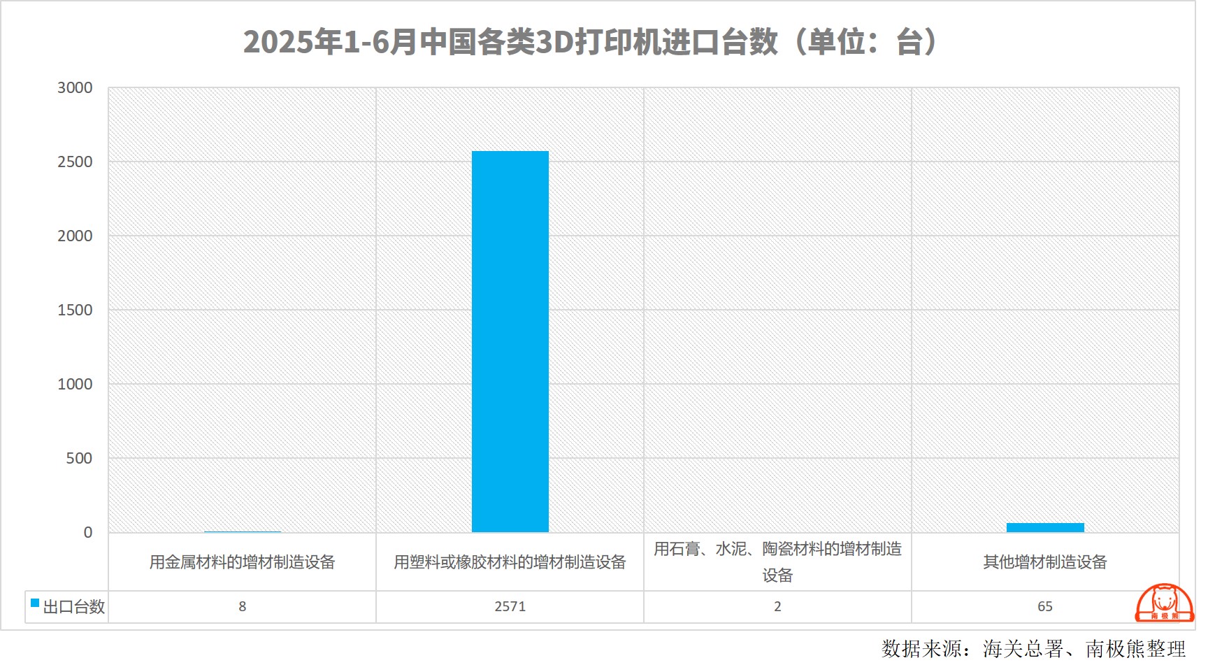 2025年1-6月,我国进口3D打印机2646台,比2024年上半年进口的727台,增长264%。其中,用金属材料的增材制造设备8台,用塑料或橡胶材料的增材制造设备2571台,用石膏、水泥、陶瓷材料的增材制造设备2台,其他增材制造设备65台。与10年前金属3D打印机进口为主的情况相比,目前我国的金属3D打印机已经实现了自给自足,每年数千台的装机量,仅有几十台需要进口。