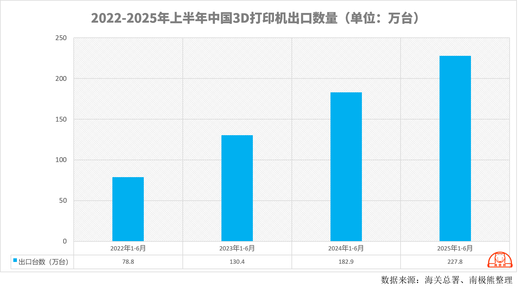 2025年1-6月,中国出口3D打印机227.8万台(不含零部件),相较于2024年上半年出口的182.9万台(不含零部件),增长24.5%。从出口台数来看,大概每年上半年的净增量在50万台左右。