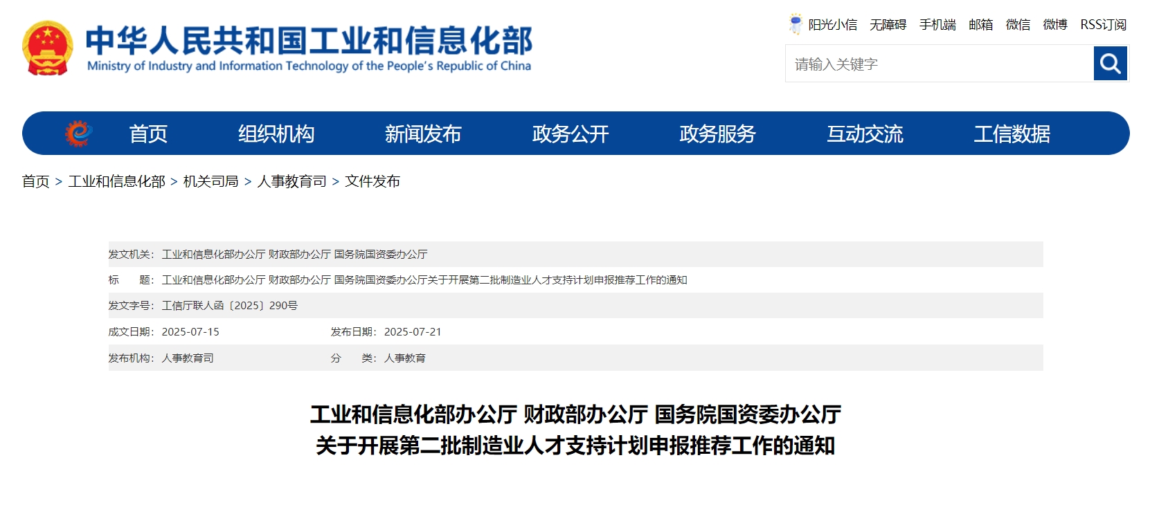 2025年7月22日,近日工业和信息化部办公厅、财政部办公厅、国务院国资委办公厅联合发布了“关于开展第二批制造业人才支持计划申报推荐工作的通知”。2025年,面向全国工业和信息化重点领域,遴选支持100名左右创新企业家、300名左右先进制造技术人才、500名左右先进基础工艺人才。