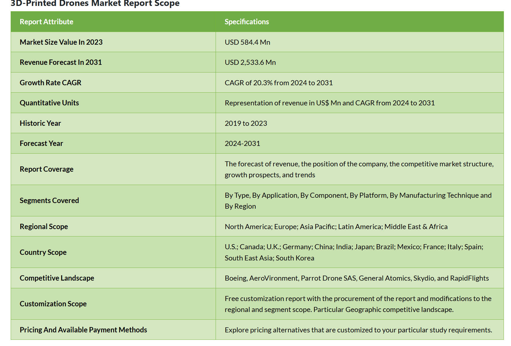 市场细分:报告详细分析了市场的多维度细分,反映出3D打印无人机技术的广泛适用性和巨大发展潜力,为相关企业制定精准的市场策略提供了重要参考: