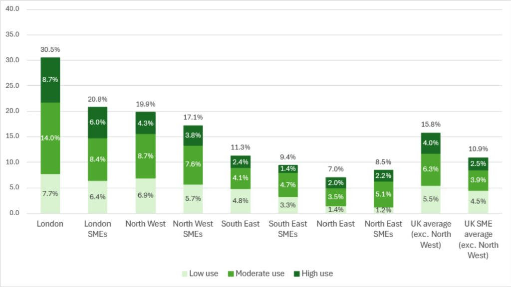 大曼彻斯特地区增材制造应用率位居英国第二,仅次于伦敦。这个地区六分之一以上的中小企业使用3D打印技术,而全国范围内这一比例略高于十分之一。大多数企业表示3D打印技术使用率有限,近五分之四的企业表示3D打印使用率较低或中等。在全国范围内,只有17%的企业表示采用了该技术,这使得3D打印技术落后于人工智能和机器人技术。
