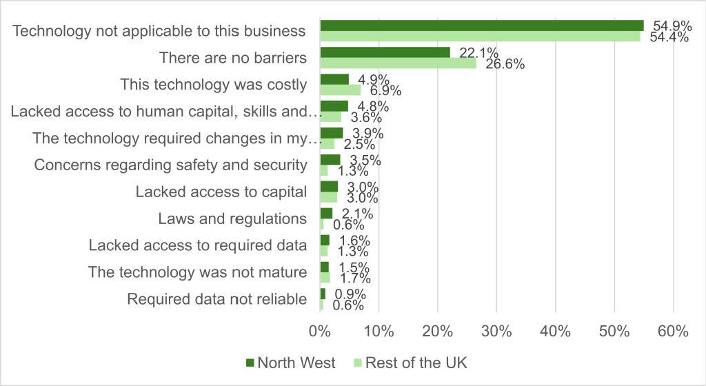 调查结果显示,认知度和适用性是比成本更大的障碍。超过一半的大曼彻斯特中小企业表示,3D打印与它们的业务无关,几乎与全国平均水平相同。略超过五分之一的受访者表示没有遇到任何障碍,但仍未采用,这表明激励措施仍不明确。不到百分之五的受访者认为成本是障碍,而同样比例的受访者则指出缺乏熟练的员工。较少的受访者提到了技术不成熟、数据不可靠、法律限制或安全隐患。