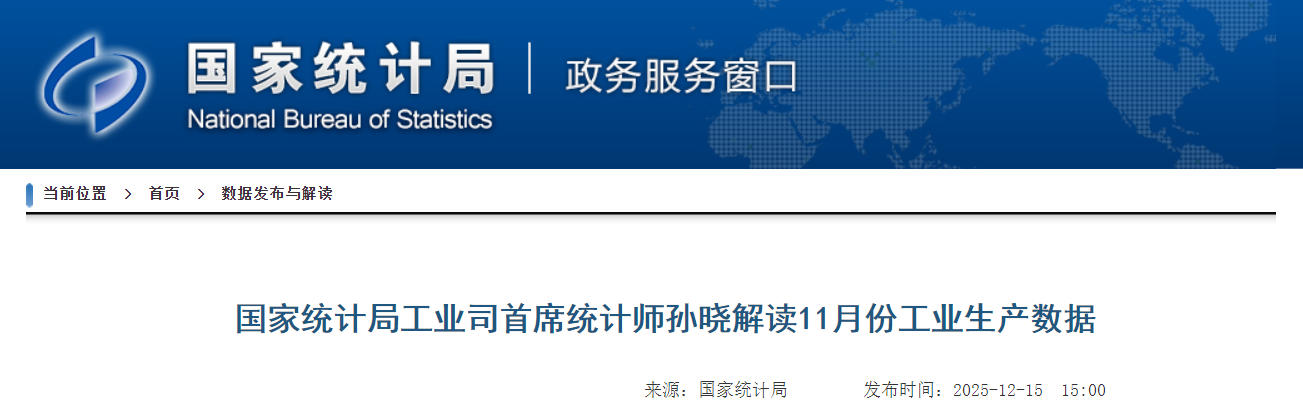 2025年12月15日,国家统计局发布了11月份的工业生产数据。11月份,规模以上工业增加值同比增长4.8%,增速和上月基本持平。产业升级发展带动下,技术含量和附加值较高的装备制造业快速发展。11月份,装备制造业增加值同比增长7.7%,继续快于全部规模以上工业增长,对规模以上工业增加值增长的贡献率达到59.4%。
