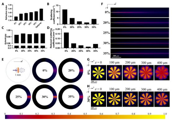 本研究通过在生物打印机的工作波长(405 nm)下测量了包含 5% GelMA 和各种浓度的 IDX 的生物墨水的折射率,验证了 IDX 可以有效地调整折射率。如图 2所示,当 IDX 浓度从 20% 增加到 35% 时,生物墨水的折射率线性增加。本研究进一步验证了适当浓度的 IDX 可以有效降低生物墨水的散射效应。材料的散射效应通常用散射系数、各向异性和折减散射系数来表征。本研究制备了包含 5% GelMA、4000 万个细胞/ml 和各种 IDX 浓度的生物墨水,并使用结合蒙特卡罗模拟和粒子群优化算法的方法来确定生物墨水在生物打印机工作波长(405 nm)下的散射特性。这些生物墨水的测量散射系数、各向异性和减少的散射系数如图 2(B 至 D)所示。高散射系数和接近 1 的各向异性值表明载有细胞的生物墨水是高度光散射的,主要是前向散射。没有调整折射率的生物墨水的散射系数为 11.76 mm-1,散射系数降低为 0.164 mm-1。通过使用 30% IDX 调整折射率,生物墨水的散射系数大幅降低至 1.377 mm-1,降低后的散射系数降低至 0.014 mm-1,这意味着这种方法可以将散射降低约 10 倍。通过仔细调整 IDX 的浓度,可以进一步减少散射。