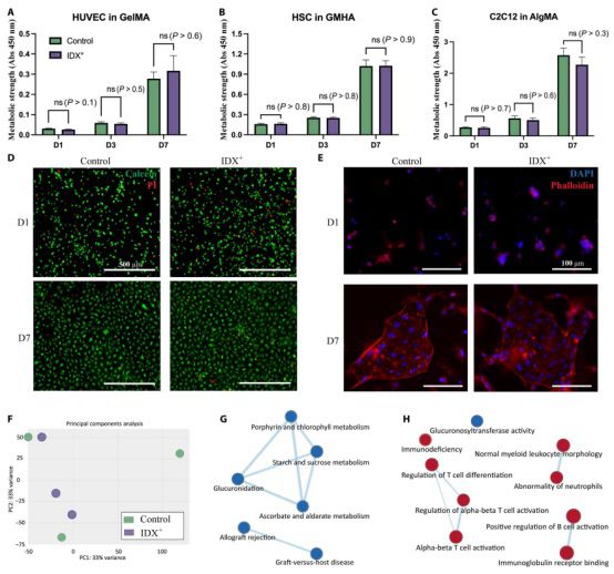 为了验证 IDX 与各种生物材料和细胞类型的生物相容性,本研究使用三种常用配方对薄板进行了生物打印:GelMA 中的人脐静脉内皮细胞 (HUVEC)、甲基丙烯酸缩水甘油酯透明质酸 (GMHA) 中的人雪旺细胞 (HSC) 和藻酸盐甲基丙烯酸酯 (AlgMA) 中的 C2C12。由于理想的 IDX 浓度范围在 20% 到 35% 之间变化,本研究比较了使用 0% 或 35% IDX 的 3D 打印组织。使用 Cell Counting Kit-8 (CCK-8) 测定法测量的代谢活性强度表明,在 7 天的培养过程中,所有三种类型的生物墨水中封装的细胞呈指数增长。此外,与对照相比,使用 IDX 对细胞的代谢活性没有统计学显着影响,这意味着 IDX 不会阻碍细胞增殖(图 3)。此外,本研究还使用活/死染色来表征细胞活力。GelMA 生物墨水中的 HUVEC 打印为 IDX 为 0 或 35% 的薄板。总体而言,在培养的第 1 天和第 7 天,大多数细胞对于 0% 和 35% IDX 样本都是存活的。在 0% 和 35% IDX 之间没有观察到显着的质量差异,这意味着IDX 的掺入不会显着影响细胞活力。
