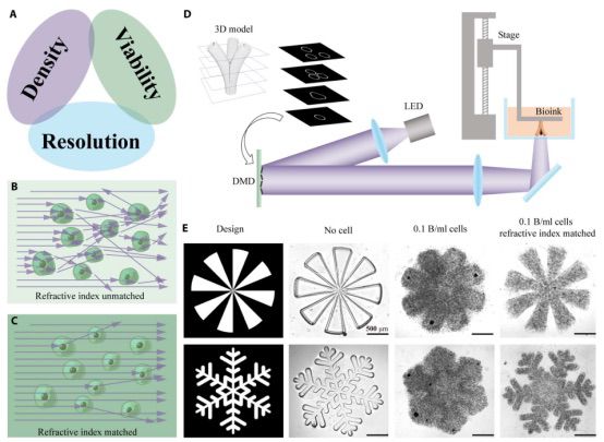 工程组织是由生物材料支架和活细胞组成的人工功能组织。工程组织已经发现了许多生物医学应用,包括基础生物医学研究、疾病建模、药物测试、个性化医疗、再生医学和器官移植。与传统的2D单层细胞模型或动物模型相比,3D工程组织有望准确概括天然组织的3D结构,细胞类型以及物理和生化环境,为体外组织或器官模型提供更好的生物相关性,可扩展性和可重复性。此外,用自体细胞开发的3D工程可移植组织和器官可能会潜在地减轻与器官供体短缺和免疫排斥相关的问题。因此,组织工程引起了大量的研究兴趣。然而,同时满足高细胞密度、高细胞活力和高分辨率的要求是十分具有挑战性的。特别是,由于光散射,基于数字光处理的3D生物打印的生物打印分辨率随着生物墨水细胞密度的增加而受到影响。