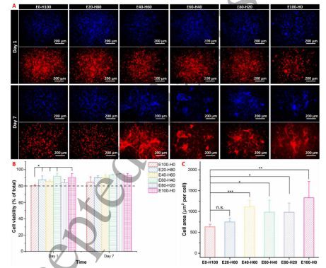 此外,与第1天相比,细胞密度有所降低(图2A)。相比之下,在 E40-H60 组中发现了MSC的交错细胞骨架网络,并且在孵育7天后也可以观察到 E60-H40、E80-H20 和 E100-H20 组中的细胞附着和扩散(图2A),即细胞可以在用 EW 修饰的Alg生物墨水中附着和扩散;然而,EW的浓度应超过40%才能产生显着效果。为了进一步分析不同支架中的细胞形态,对培养7天后的细胞面积(细胞骨架染色的覆盖面积)进行了定量测量(图2C);结果表明含有EW的Alg墨水可以促进MSC在凝胶中的附着和扩散,并且 EW 的量不应低于40%。