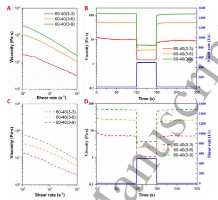 流变学特性是对糊状生物材料的印刷适性具有决定性影响的物理化学参数,基于开发的油墨的生物学特性评估结果,油墨组合物 60-40(3-3)、60-40(3-6) 和 60-40(3-9) 的流变学特性为通过剪切斜坡和剪切恢复试验进行研究。通过将 MC 浓度从 3% 增加到 9%,a在 0 到 100 s−1 的剪切速率范围内实现了粘度的稳定增加,同时所有组也表现出出色的剪切稀化行为(图5A)。