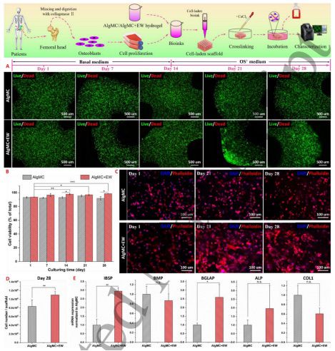 为了进一步研究 EW 对成骨分化的影响,将从骨关节炎患者的人股骨头中分离出来的hOB悬浮在 AlgMC + EW 生物墨水中以制造载有 hOB 的支架;同时,载有hOB的普通 AlgMC 支架作为对照组进行了生物打印(图8A)。AlgMC+EW墨水中的大部分hOB显示出具有高细胞密度的细长形态,而在AlgMC支架中仍观察到球形。此外,对支架中的细胞核和细胞骨架进行荧光染色,以进一步观察第1、21和28天的细胞形态。而AlgMC支架中的细胞仍然小而圆,只有少数细胞表现出轻微的细长细胞形态;类似的结果一直保持到第28天。此外,图8D说明AlgMC+EW 支架内的细胞数量明显高于AlgMC。这些结果表明 EW 具有促进 hOB 细胞粘附、扩散、迁移和增殖的功能(图8)。在成骨培养基中培养后,这种效果甚至会增强,这可能是由于基于EW的生物墨水中存在蛋白质,它为细胞附着提供了整合素结合基序。