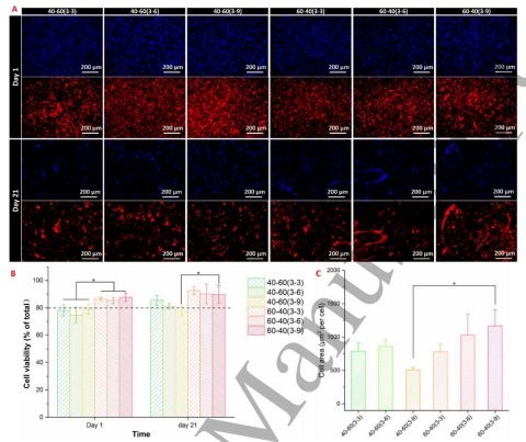 为了进一步研究细胞形态,在培养1天和21天后对细胞核和肌动蛋白细胞骨架进行荧光染色,捕获的图像如图4A所示。60% EW组比40% EW组更成功地支持细胞生长,从细胞骨架的形态学分析来看,具有 60% EW 的组表现出更好的细胞粘附和扩散,可能是因为这些材料为 MSC 提供了更多的粘附位点和友好的微环境。根据细胞骨架染色后的显微照片定量分析细胞面积显示,60%EW组的细胞面积大于40%EW组(图4C)。这些结果初步表明,具有60% EW的AlgMC生物墨水在生物打印结构中具有良好细胞反应,表现优于40% EW组。因此,具有60% EW的AlgMC生物墨水用于进一步的实验。