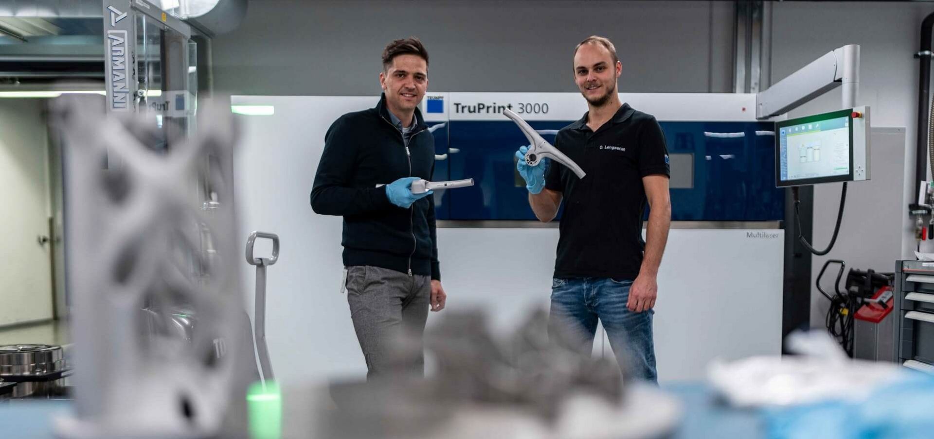 时间回溯到2022年的Eurobike自行车展,Maxime Lallemand和Quentin Beauregard在那里与TRUMPF公司的增材制造技术专家Chris Lengwenat及其同事Nicolas Haydt相遇。这两位TRUMPF专家不仅带来了他们的专业知识,还带来了他们亲自设计并使用TruPrint 3D打印机打印的铝制和钛制刹车手柄、刹车卡钳和踏板。