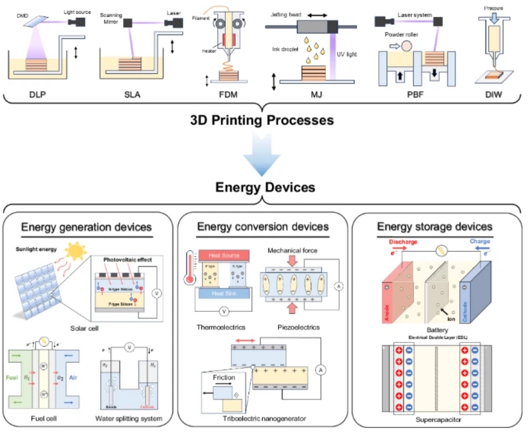 尽管最近发表了许多出版物,但重点关注能源应用的3D打印,仍然缺乏一个简明的综述,涵盖3D打印领域内从发电和转换到存储的广泛能源生命周期。近期,韩国首尔国立大学Howon Lee等简要概述了3D打印能源设备在各种能源应用中的最新进展来填补这一空白。
