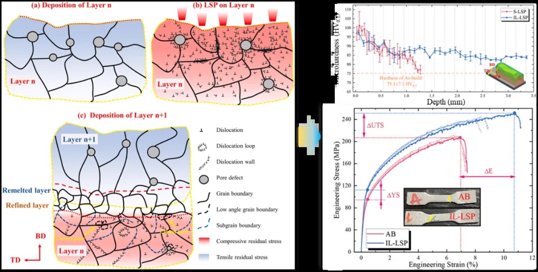 研究亮点:本研究在国内外首次成功实现了电弧增材制造与层间激光冲击强化复合制造。为克服电弧熔丝沉积层与重熔层厚度过高的问题,本研究创新的采用螺旋振荡路径,将每个沉积层的厚度限制在激光冲击的影响层厚度之内。与沉积态样品相比,层间激光冲击处理后的样品孔隙数量降低了73.9%。同时,复合工艺制造的拉伸样品拉伸强度,屈服强度和伸长率分别提升了 20.1%,19.1% 和27.3%。此外,由于复合工艺层间强化的工艺特点,后续热输入层能够在已有强化层缺陷闭合的基础上实现缺陷的冶金结合。这种消除缺陷的机理以及层间位错密度的累积是导致强度和塑性同时提升的原因。