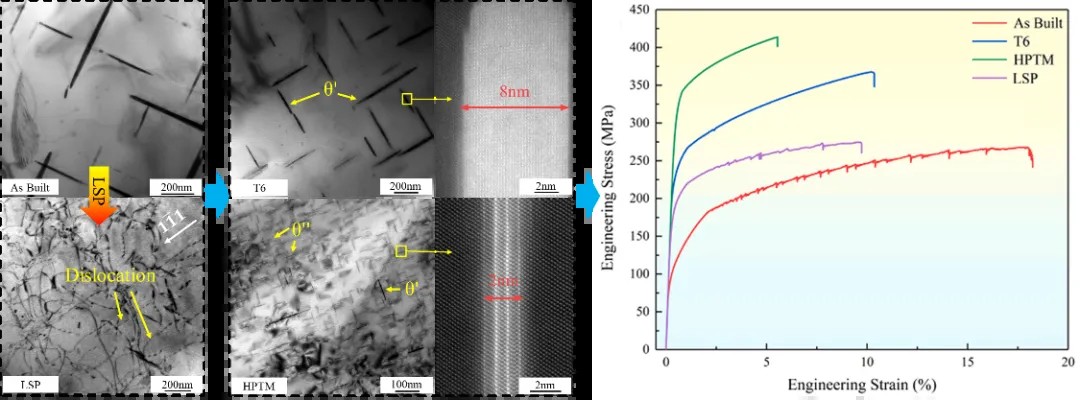 研究亮点:本研究针对电弧熔丝增材制造的2319铝铜合金,结合激光冲击强化工艺和热处理工艺,开发了固溶+激光冲击强化+时效的复合后处理工艺。该复合工艺实现了构件内部孔隙的有效闭合,并通过激光冲击引入位错,在后续时效过程中有效促进析出并延缓析出相粗化,最终有效的提高了构件的力学性能。相比于传统T6热处理,复合后处理工艺试样的抗拉强度,屈服强度分别提高了13%和38%,力学性能具体为抗拉强度:412.2MPa,屈服强度:322.9MPa,延伸率:7.2%。