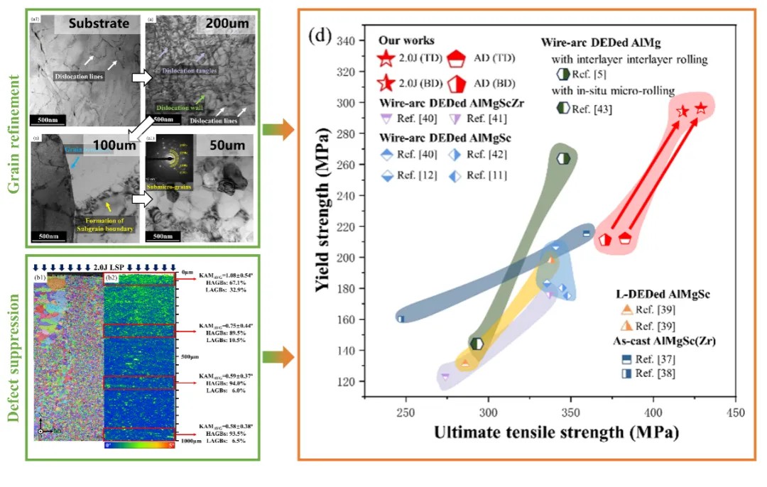 研究亮点:在本研究中,利用激光冲击强化(LSP)处理了电弧熔丝增材Al-6Mg-0.3Sc薄壁构件。结果表明,LSP在近表面形成了亚微米晶粒梯度组织。准原位CT量化了LSP对电弧熔丝增材缺陷的影响,表明孔隙率降低了68%以上。同时,与沉积态(AD)相比,由于位错的积累和连续的动态再结晶导致晶粒细化,以及三峰组织的出现,抗拉强度提高了39.5%,达到295.8±6.4 MPa,而延伸率仅略有下降。本研究为制造高性能无需热处理的大型薄壁构件提供了一种新的解决方案。