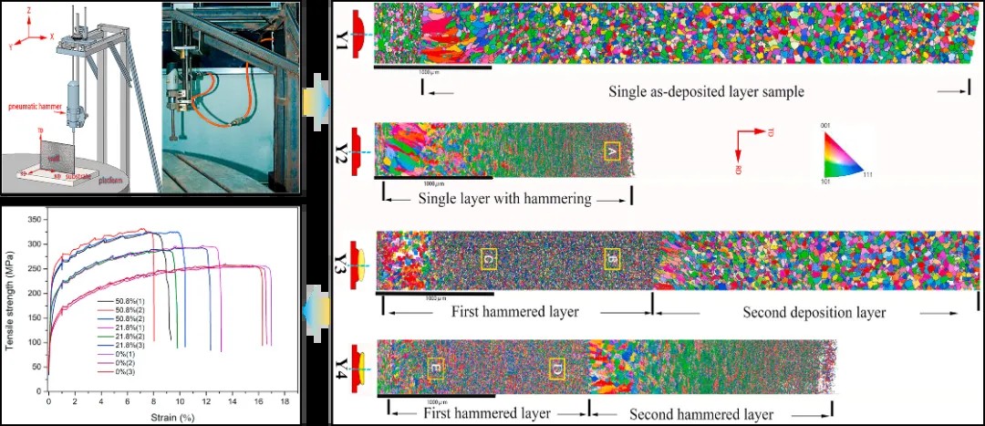 本文针对电弧熔丝增材制造铝合金构件力学性能薄弱的问题,引入层间锤击工艺,研究了不同变形量下,层间锤击工艺对增材制造2319铝合金构件整体力学性能的提升效果及潜在的强化机制(Google Scholar被引160次)。与沉积态试样相比,50.8%变形试样的屈服强度和极限抗拉强度分别从148.4 MPa和288.6 MPa提高到240.9 MPa和334.6 MPa。层间锤击通过后续沉积层提供的原位热处理效果,促使锤击层内的晶粒发生回复和静态再结晶,进而达到晶粒细化的目的。而后续的层间锤击使再结晶晶粒再次变形,进一步提升位错密度,从而提高了2319铝合金的极限抗拉强度。
