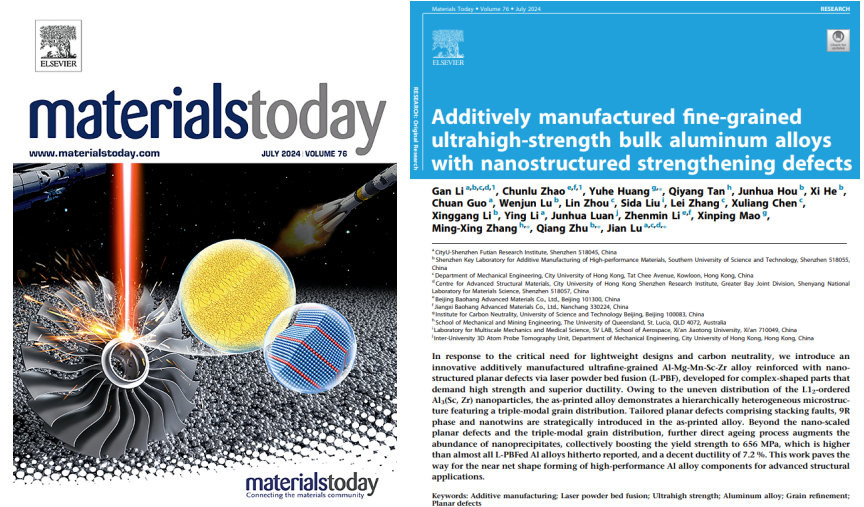该合金材料在热处理后展现出卓越的性能指标,屈服强度高达656 MPa,同时保持了7.2%的延伸率,这一数据不仅刷新了L-PBF技术生产的铝合金强度记录,也展示了其优异的综合力学性能。这一创新成果Additively manufactured fine-grained ultrahigh-strength bulk aluminum alloys with nanostructured strengthening defects已作为封面文章发表在顶尖学术期刊Materials Today上(影响因子:21.1),引起了学术界与工业界的广泛关注。