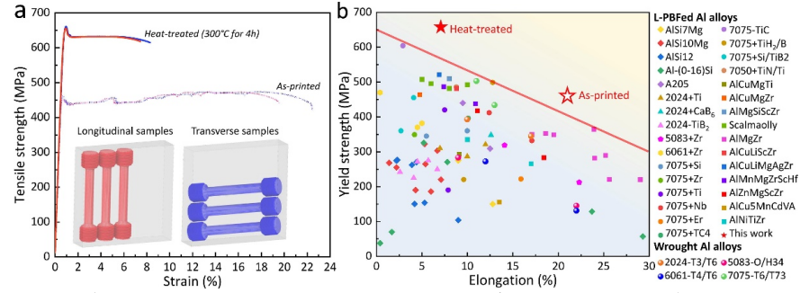 为了进一步提升其沉淀强化效果,研究团队采用了直接时效热处理工艺,即在300摄氏度下处理4小时,以促进更多纳米级强化相的析出。值得注意的是,热处理不仅增强了强化效果,还成功保留了打印态组织中原有的纳米级面缺陷及三模态晶粒异质结构,这一双重作用赋予了合金优异的综合性能——既具备超高的屈服强度(约656 MPa),又保持了优异的塑性(约7.2%)。这一热处理后的合金性能,显著超越了目前已知的大多数增材制造高强铝合金及锻造铝合金的屈服强度记录。