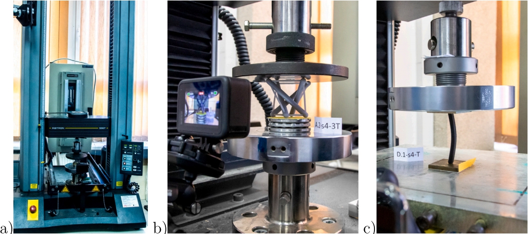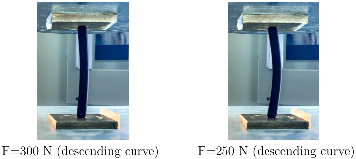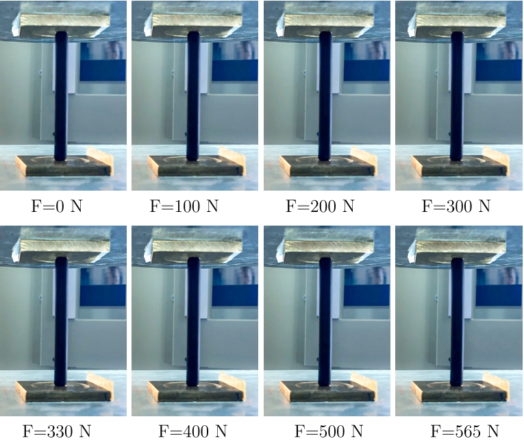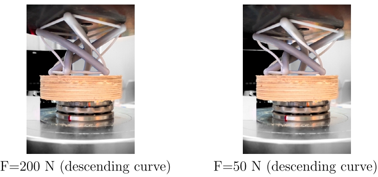 实验测试是在INSTRON 5567万能试验机上进行的,使用位移控制方法,速度为2 mm/min。测试结果(力与时间对应的位移)直接从万能试验机记录,并通过数字相机记录测试过程。在模块测试中,使用推力球轴承确保其中一个基座的自由旋转,使结构能够保持其关键的受力激发特征,即与微小机制模式一致的自由运动。在单杆测试中,使用两个钢制基座:一个放置在试验机的下基座上,另一个粘在上基座上。下基座的移动允许在初始放置后垂直定位样品。