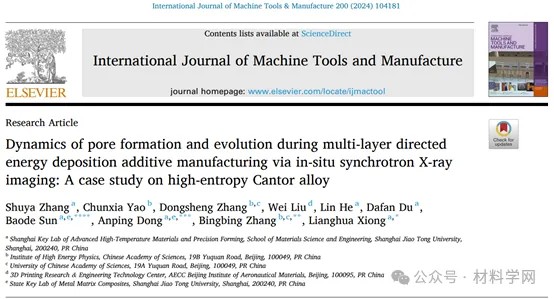 该工作利用同步辐射高能X射线快速成像技术,对典型高熵Cantor合金在传导模式下的多层定向能量沉积(DED)过程进行了原位研究,揭示了三种新的孔洞形成机制,并验证了三种已知的孔洞生成机制;与此同时,基于熔池尺度流场高时空分辨表征,提出了一种调控马兰戈尼流实现孔隙消除新机制。这些发现为高熵合金的增材制造提供了关键的实验数据,有助于开发精准的计算模型和深入理解熔池微观尺度下的孔隙控制策略。上海交通大学材料科学与工程学院博士生张书雅为论文第一作者,上海交通大学材料科学与工程学院孙宝德教授、董安平研究员、熊良华副教授、中国科学院高能物理研究所张兵兵副研究员为论文共同通讯作者,上海交通大学为论文第一完成单位。
