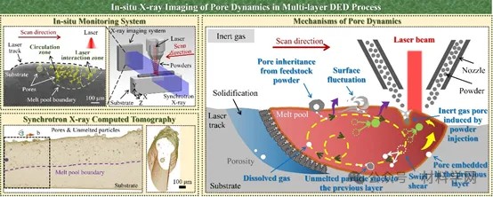图1 同步辐射原位研究激光定向能量沉积增材制造过程,从熔池尺度高精度高时空分辨揭示内部孔洞形成及演化新机制。