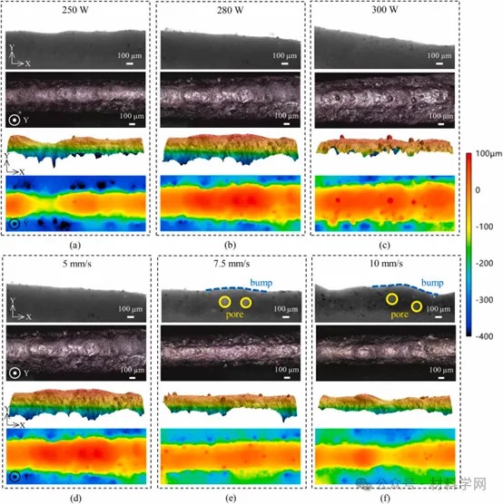 图4 Cantor合金多道次熔覆后熔道形貌,可以看出激光能量密度严重影响多道次熔道内部缺陷生成和熔池表面起伏以及凝固后成形质量。