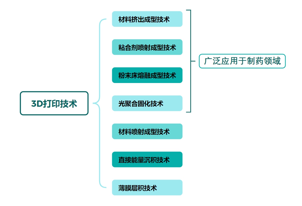 3D打印是一种快速成型技术,使用数字模型文件作为基础,通过逐层打印的方式来构造物体。它通常使用数字技术材料打印机来实现。3D打印在许多领域都有应用,如珠宝、鞋类、工业设计、建筑、工程和施工、汽车、航空航天、牙科和医疗产业等。在技术分类上,按照美国材料与试验协会(ASTM)F42增材制造技术委员会的分类标准,3D打印技术可分下列为7类,其中,材料挤出成型技术、粘合剂喷射成型技术、粉末床熔融成型技术和光聚合固化技术这4大类3D打印技术,被应用于制药领域。