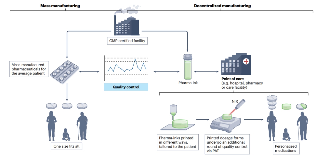 大规模生产是传统制药行业的基础,它通过生产大量药片批次来实现成本效益,并在药品运输到最终目的地之前进行严格的质量控制。3D打印技术,尤其是粉末基打印,因其高吞吐量而与传统桌面3D打印有所区别,能够实现类似大规模生产的效率。