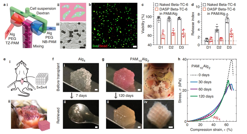 DASP 2.0技术通过使用改进的双网络生物墨水和特制的三通道打印喷头,实现了细胞封装和三维多尺度多孔支架的打印,这些支架具有高效的营养传输能力和机械稳健性。利用Beta-TC-6细胞系进行的实验表明,DASP 2.0技术能够在打印过程中保持细胞的高存活率和功能,同时在体内环境中展现出卓越的长期稳定性和可回收性,证明了其在临床移植和生物医学研究中应用的巨大潜力。