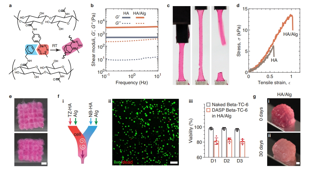 总体而言,本文介绍了DASP 2.0技术,一种创新的体素化生物打印方法,用于制造具有高度细胞相容性和机械稳健性的双网络(DN)水凝胶支架。DASP 2.0利用无添加剂点击化学反应,通过精确控制的生物墨水交联,实现了在三维空间中按需组装复杂的生物结构。虽然最初的PAM/海藻酸盐双网络生物墨水细胞相容性有限,但研究者们通过引入透明质酸(HA),一种更适合生物医学应用的天然多糖,克服了这一挑战。DASP 2.0技术为生物医学领域提供了一种新的工具,用于创建高度复杂且有序的三维组织结构,为组织工程和再生医学的应用开辟了新的可能性。