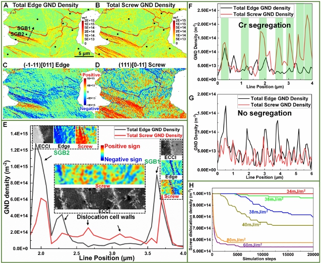 本文通过原位电子通衬度成像(ECCI)、高分辨电子背散射衍射(HR-EBSD)等先进表征技术结合三维离散位错动力学(3D-DDD)模拟手段,系统性揭示了凝固胞状结构中不同位错类型的形成机理及其对热稳定性的影响。如图1所示,研究发现:位错胞中绝大部分位错为统计储存位错(SSD),因此其取向差极小(<0.1°)。亚晶界(SGB)往往与凝固胞状结构边界重合,并且具有更高的几何必需位错(GND)。TEM-EDS结合HR-EBSD结果表明,在存在Cr元素偏析的位错胞中,螺位错类型占主导地位。而在Cr元素无明显偏析的位错胞中,探测到了刃位错为主的位错结构。上述结果表明:不同位错类型与Cr元素偏析相关,这是由于Cr元素偏析导致局部层错能的下降,大大提高了该区域螺位错的稳定性,最终形成螺位错占主导的位错结构。