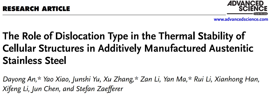 近日,上海交通大学材料学院塑性成形技术与装备研究院陈军教授课题组安大勇副教授,联合西南交通大学力学与航空航天学院张旭教授和德国马普钢铁所材料可持续合成课题组组长马焱博士(现荷兰代尔夫特大学助理教授)等,在增材制造奥氏体不锈钢胞状结构热稳定性机理研究中取得了重要进展,相关成果以“The