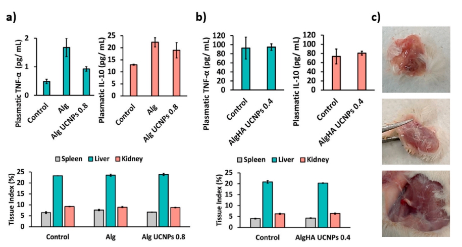 如图3所示,汇总了小鼠和大鼠在不同气凝胶配方(Alg、Alg UCNPs 0.8和AlgHA UCNPs 0.4)皮下植入1周后,血浆中肿瘤坏死因子α(TNF-α)、白细胞介素6(IL-6)和白细胞介素10(IL-10)的表达水平以及主要器官(脾脏、肝脏和肾脏)的组织指数。结果显示,所有实验组的TNF-α和IL-10水平与对照组相比没有显著差异,且IL-6的水平未检测到,这表明植入的气凝胶引发了低水平的炎症反应。组织指数的测定也未显示出统计学上的显著差异,表明植入的气凝胶没有对主要器官造成毒性。此外,3c图像显示了植入后1周在植入部位形成的结缔组织囊,这表明了气凝胶植入后的局部组织反应。这些结果综合反映了UCNPs标记的气凝胶在体内的生物相容性和安全性。