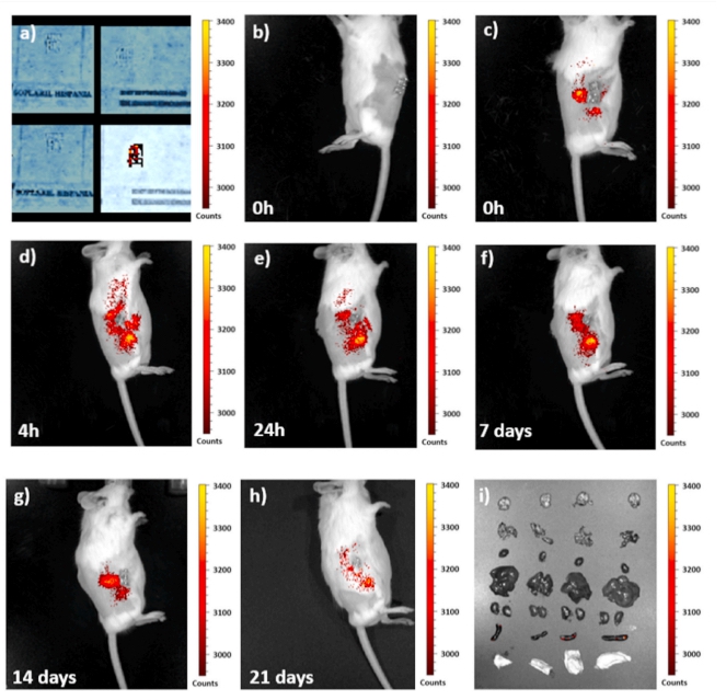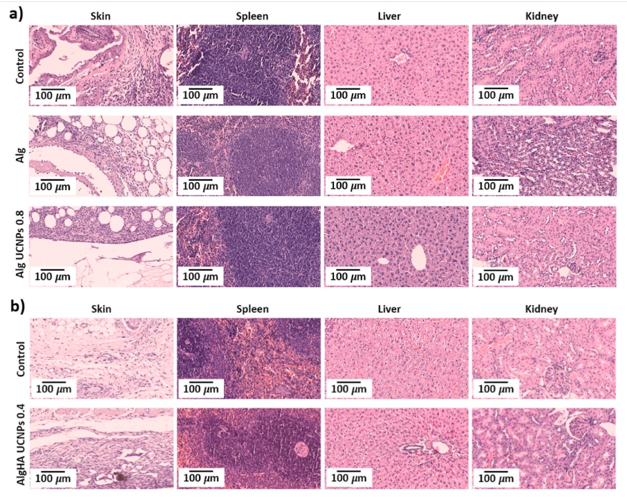 使用了植入了标记有UCNPs的海藻酸盐气凝胶的小鼠模型,在植入后的不同时间点(手术后立即、4小时、1天以及1周、2周和3周)利用荧光成像系统(IVIS®)捕捉图像,研究者能够实时且非侵入性地监测气凝胶的荧光信号。结果显示,荧光信号在植入部位均匀分布,并且在长达3周的监测期内保持稳定,这证明了UCNPs标记的气凝胶可以作为可追踪的植入物,用于长期监测植入物在体内的生物降解过程和位置。此外,仅在植入UCNPs标记气凝胶的小鼠的脾脏中检测到微弱的荧光信号,这可能表明UCNPs在体内的分布和代谢。这些发现突显了UCNPs在生物成像中的应用潜力,为开发新型的诊疗一体化植入物提供了科学依据。